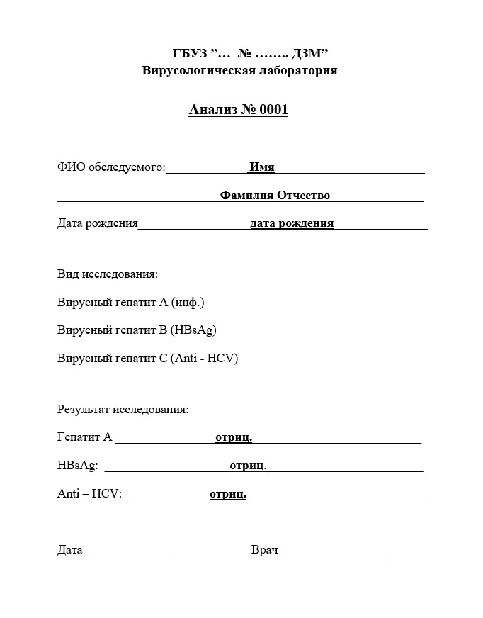 Все данные вносятся в официальный бланк теста на антитела к гепатиту A по форме, утвержденной Минздравом РФ. Документ оформляется на подлинных бланках с печатями медицинского учреждения и подписью врача-лаборанта. Никаких дополнительных справок или направлений не требуется.